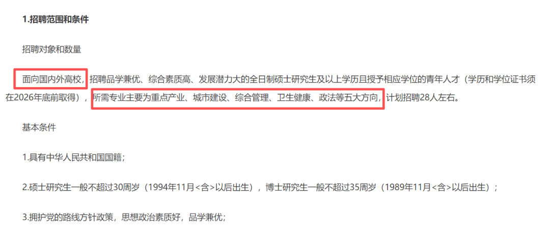 无院校排名硬门槛,招聘品学兼优、综合素质高、发展潜力大的全日制硕士研究生及以上学历且授予相应学位的青年人才(学历和学位证书须在2026年底前取得);