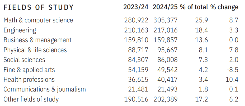 报告显示,在美国留学生专业选择上,有305,377人选择数学和计算机大类,较去年上涨8.7%。其次是工程类专业,共计217,016人,较去年上涨3.3%。接下来是商业与管理专业,共计159,857人。